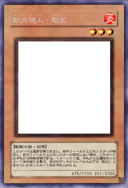 【凱炎】シリーズ4枚目は、《凱炎機人‐魁天》です。【凱炎】専用の手札「入れ替え」効果を持っています。手札から炎属性を捨てて、デッキから「凱炎」をサーチする起動効果。前々回の投稿で《凱炎機人‐大炎丸》というカードを作りましたが、その効果も「墓地へ送る」事で発動しました。