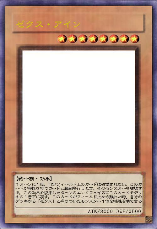 | 1ターンに1度、自分フィールド上のカードは破壊されない。このカードが属性を持つカードと戦闘を行うとき、そのモンスターを破壊する。この効果を使用したターンのエンドフェイズにこのカードをデッキの1番下に戻す。このカードがフィールド上から離れた時、自分のデッキから「ゼクス」と名のついたモンスター1体を特殊召喚できる。 | |||