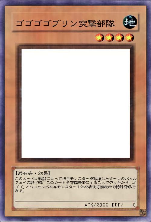 | このカードが戦闘によって相手モンスターを破壊したターンのバトルフェイズ終了時、このカードを守備表示にすることでデッキから「ゴゴゴ」とついたレベル4モンスター1体を表側守備表示で特殊召喚できる。 | |||