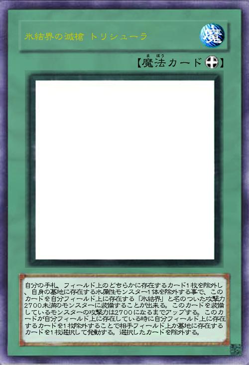| 自分の手札、フィールド上のどちらかに存在するカード1枚を除外し、自身の墓地に存在する水属性モンスター1体を除外する事で、このカードを自分フィールド上に存在する「氷結界」と名のついた攻撃力2700未満のモンスターに装備することが出来る。このカードを装備しているモンスターの攻撃力は2700になるまでアップする。このカードが自分フィールド上に存在している時に自分フィールド上に存在するカードを1枚除外することで相手フィールド上か墓地に存在するカードを1枚選択して発動する。選択したカードを除外する。 | |||