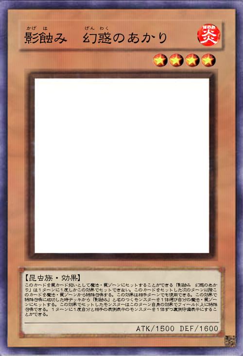 「影蝕み4枚目。炎属性昆虫族ってなかなかいなかった気がする。元ネタは蛍で光枠だったけど炎枠に入りそうな虫が浮かばなかったのでこいつが炎にw」(2013-08-04 19:53)