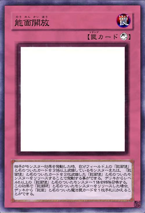 | 相手がモンスター効果を発動した時、自分フィールド上の「能面使」と名のついたカードを3体以上装備しているモンスターまたは、「能面使」と名のついたカードを2枚装備した「能面使」と名のついたモンスターをリリースすることで発動する事ができる。デッキからレベル8以上の「能面使」と名のついたモンスター1体を特殊召喚する。この効果で「能面師」と名のついたモンスターをリリースした場合、デッキから「能面」と名のついた魔法罠カードを1枚手札に加えることができる。 | |||