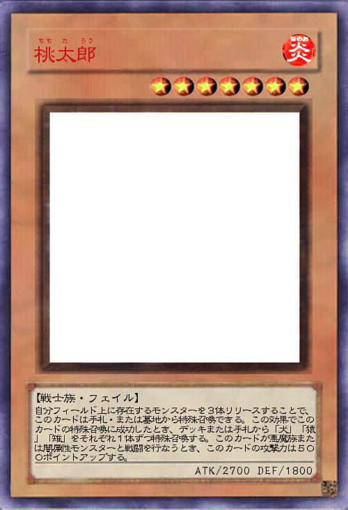 | 自分フィールド上に存在するモンスターを3体リリースすることで、このカードは手札・または墓地から特殊召喚できる。この効果でこのカードの特殊召喚に成功したとき、デッキまたは手札から「犬」「猿」「雉」をそれぞれ1体ずつ特殊召喚する。このカードが悪魔族または闇属性モンスターと戦闘を行なうとき、このカードの攻撃力は500ポイントアップする。 | |||