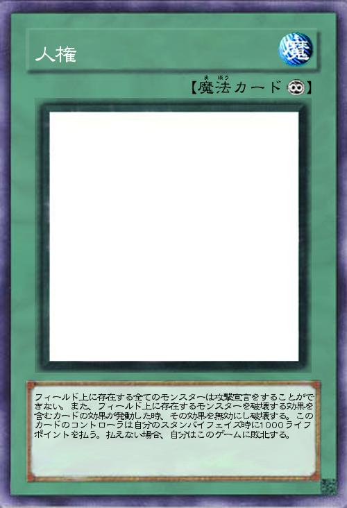 | フィールド上に存在する全てのモンスターは攻撃宣言をすることができない。また、フィールド上に存在するモンスターを破壊する効果を含むカードの効果が発動した時、その効果を無効にし破壊する。このカードのコントローラは自分のスタンバイフェイズ時に1000ライフポイントを払う。払えない場合、自分はこのゲームに敗北する。 | |||