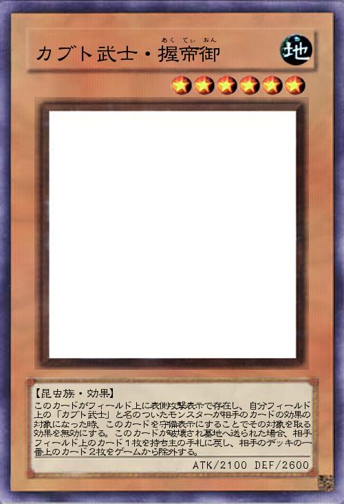| このカードがフィールド上に表側攻撃表示で存在し、自分フィールド上の「カブト武士」と名のついたモンスターが相手のカードの効果の対象になった時、このカードを守備表示にすることでその対象を取る効果を無効にする。このカードが破壊され墓地へ送られた場合、相手フィールド上のカード1枚を持ち主の手札に戻し、相手のデッキの一番上のカード2枚をゲームから除外する。 | |||