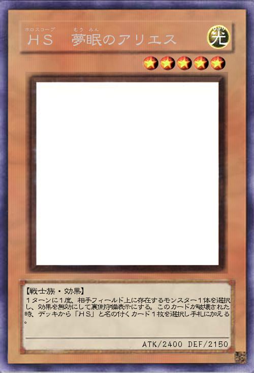 | 1ターンに1度、相手フィールド上に存在するモンスター1体を選択し、効果を無効にして裏側守備表示にする。このカードが破壊された時、デッキから「HS」と名の付くカード1枚を選択し手札に加える。 | |||