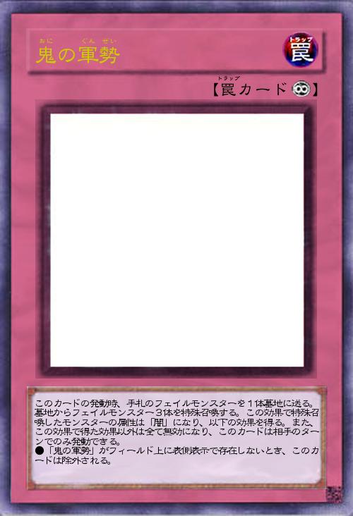 このカードの発動時、手札のフェイルモンスターを1体墓地に送る。墓地からフェイルモンスター3体を特殊召喚する。この効果で特殊召喚したモンスターの属性は「闇」になり、以下の効果を得る。また、この効果で得た効果以外は全て無効になり、このカードは相手のターンでのみ発動できる。 ●「鬼の軍勢」がフィールド上に表側表示で存在しないとき、このカードは除外される。 |