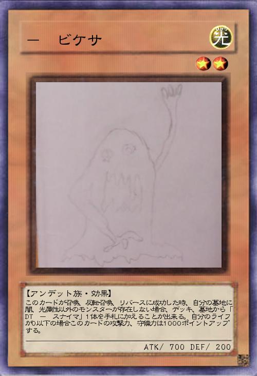 | このカードが召喚、反転召喚、リバースに成功した時、自分の墓地に闇、光属性以外のモンスターが存在しない場合、デッキ、墓地から「DT - スナイマ」1体を手札に加えることが出来る。自分のライフが0以下の場合このカードの攻撃力、守備力は1000ポイントアップする。 | |||