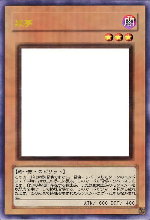 | このカードは特殊召喚できない。召喚・リバースしたターンのエンドフェイズ時に持ち主の手札に戻る。このカードが召喚・リバースしたとき、自分の墓地に存在する戦士族、または獣戦士族のモンスターを攻撃力を半分にして特殊召喚する。このカードがフィールドから離れたとき、この効果で特殊召喚されたモンスターはゲームから除外される。 | |||