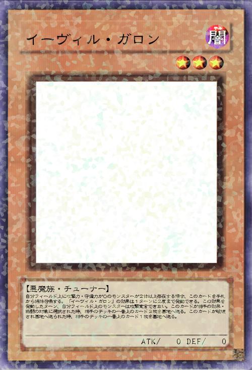 | 自分フィールド上に攻撃力・守備力が0のモンスターが2体以上存在する場合、このカードを手札から特殊召喚する。「イーヴィル・ガロン」の効果は1ターンに2度まで発動できる。この効果を発動したターン、自分フィールド上のモンスターは攻撃宣言できない。このカードが相手の効果・戦闘の対象に選択された時、相手のデッキの一番上のカード3枚を墓地へ送る。このカードが破壊され墓地へ送られた時、相手のデッキの一番上のカード1枚を墓地へ送る。 | |||