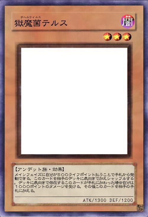 | メインフェイズに自分が500ライフポイント払うことで手札から発動できる。このカードを相手のデッキに表向きで加えシャッフルする。デッキに表向きで存在するこのカードが手札に加わった場合自分は1000ポイントのダメージを受ける。その後このカードを相手の手札に加える。 | |||