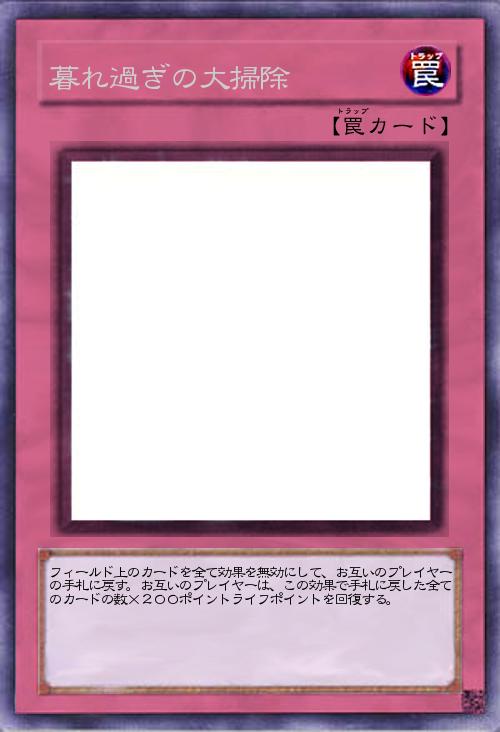 | フィールド上のカードを全て効果を無効にして、お互いのプレイヤーの手札に戻す。お互いのプレイヤーは、この効果で手札に戻した全てのカードの数×200ポイントライフポイントを回復する。 | |||
