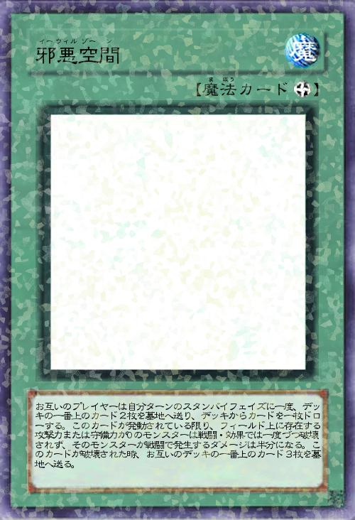 | お互いのプレイヤーは自分ターンのスタンバイフェイズに一度、デッキの一番上のカード2枚を墓地へ送り、デッキからカードを一枚ドローする。このカードが発動されている限り、フィールド上に存在する攻撃力または守備力が0のモンスターは戦闘・効果では一度づつ破壊されず、そのモンスターが戦闘で発生するダメージは半分になる。このカードが破壊された時、お互いのデッキの一番上のカード3枚を墓地へ送る。 | |||