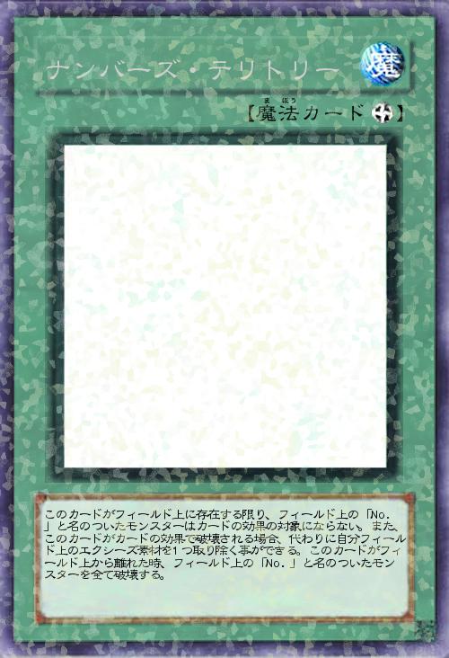 | このカードがフィールド上に存在する限り、フィールド上の「No.」と名のついたモンスターはカードの効果の対象にならない。また、このカードがカードの効果で破壊される場合、代わりに自分フィールド上のエクシーズ素材を1つ取り除く事ができる。このカードがフィールド上から離れた時、フィールド上の「No.」と名のついたモンスターを全て破壊する。 | |||