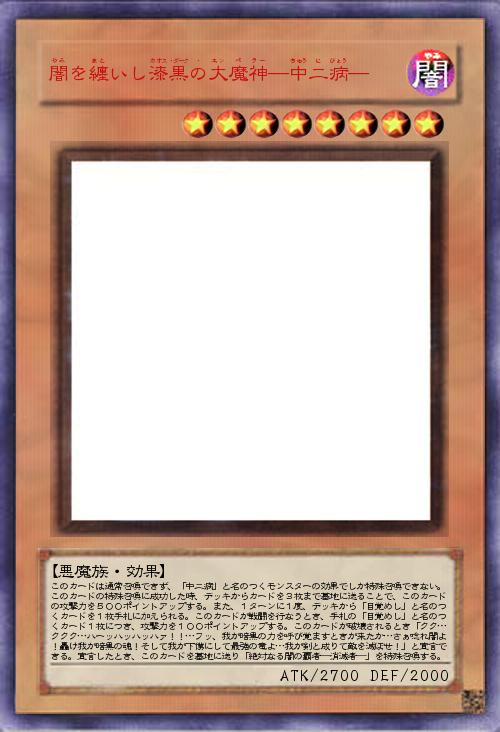| このカードは通常召喚できず、「中二病」と名のつくモンスターの効果でしか特殊召喚できない。このカードの特殊召喚に成功した時、デッキからカードを3枚まで墓地に送ることで、このカードの攻撃力を500ポイントアップする。また、1ターンに1度、デッキから「目覚めし」と名のつくカードを1枚手札に加えられる。このカードが戦闘を行なうとき、手札の「目覚めし」と名のつくカード1枚につき、攻撃力を100ポイントアップする。このカードが破壊されるとき「クク…ククク…ハーッハッハッハァ!!…フッ、我が暗黒の力を呼び覚ますときが来たか…さぁ唸れ闇よ!轟け我が暗黒の魂!そして我が下僕にして最強の竜よ…我が剣と成りて敵を滅ぼせ!」と宣言できる。宣言したとき、このカードを墓地に送り「絶対なる闇の覇者―消滅者―」を特殊召喚する。 | |||