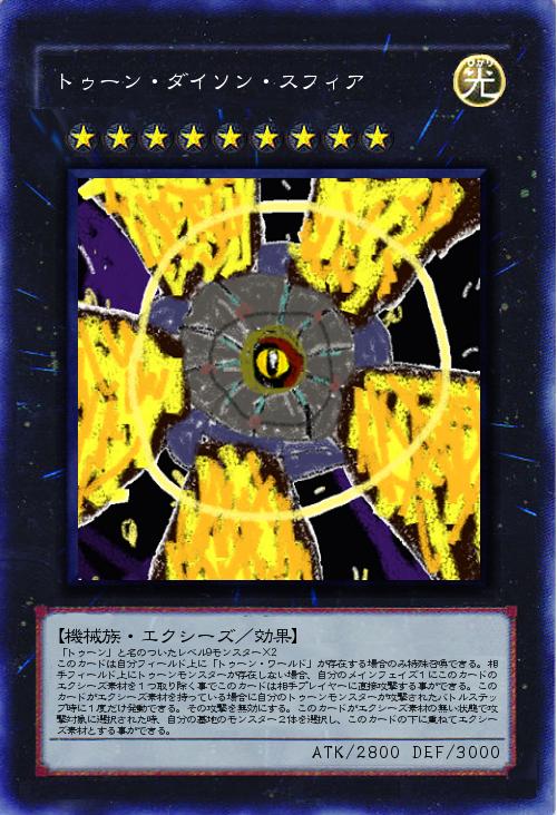 「トゥーン」と名のついたレベル9モンスター×2 このカードは自分フィールド上に「トゥーン・ワールド」が存在する場合のみ特殊召喚できる。相手フィールド上にトゥーンモンスターが存在しない場合、自分のメインフェイズ1にこのカードのエクシーズ素材を1つ取り除く事でこのカードは相手プレイヤーに直接攻撃する事ができる。このカードがエクシーズ素材を持っている場合に自分のトゥーンモンスターが攻撃されたバトルステップ時に1度だけ発動できる。その攻撃を無効にする。このカードがエクシーズ素材の無い状態で攻撃対象に選択された時、自分の墓地のモンスター2体を選択し、このカードの下に重ねてエクシーズ素材とする事ができる。 |