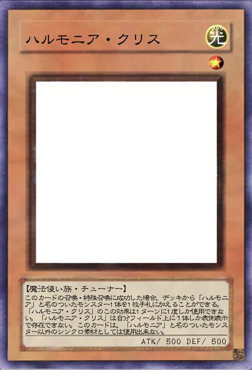 | このカードの召喚・特殊召喚に成功した場合、デッキから「ハルモニア」と名のついたモンスター1体を1枚手札に加えることができる。「ハルモニア・クリス」のこの効果は1ターンに1度しか使用できない。「ハルモニア・クリス」は自分フィールド上に1体しか表側表示で存在できない。このカードは、「ハルモニア」と名のついたモンスター以外のシンクロ素材としては使用出来ない。 | |||