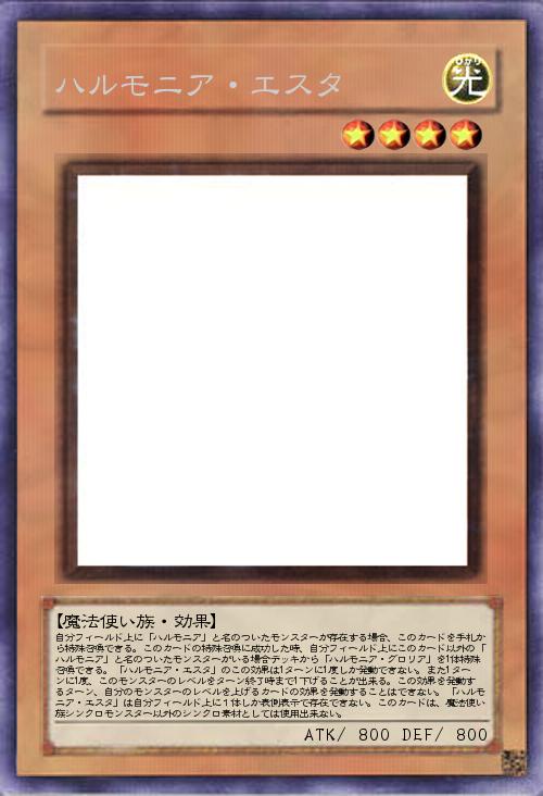 | 自分フィールド上に「ハルモニア」と名のついたモンスターが存在する場合、このカードを手札から特殊召喚できる。このカードの特殊召喚に成功した時、自分フィールド上にこのカード以外の「ハルモニア」と名のついたモンスターがいる場合デッキから「ハルモニア・グロリア」を1体特殊召喚できる。「ハルモニア・エスタ」のこの効果は1ターンに1度しか発動できない。また1ターンに1度、このモンスターのレベルをターン終了時まで1下げることが出来る。この効果を発動するターン、自分のモンスターのレベルを上げるカードの効果を発動することはできない。「ハルモニア・エスタ」は自分フィールド上に1体しか表側表示で存在できない。このカードは、魔法使い族シンクロモンスター以外のシンクロ素材としては使用出来ない。 | |||