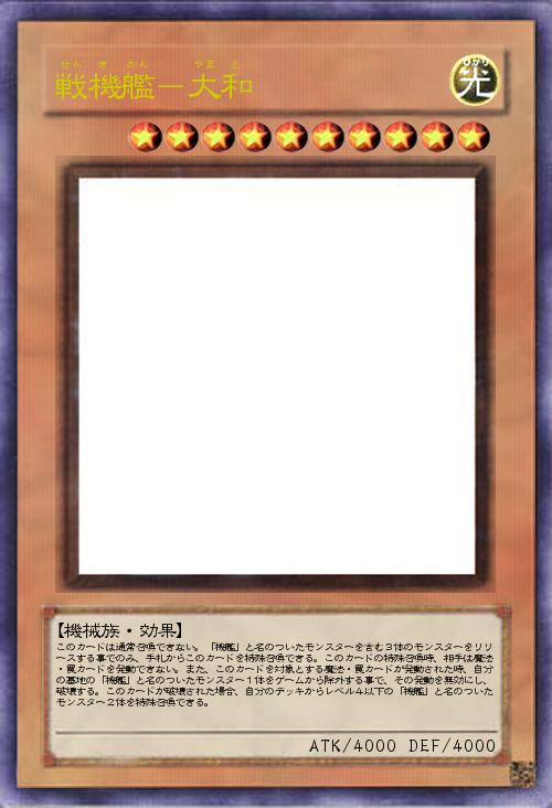 | このカードは通常召喚できない。「機艦」と名のついたモンスターを含む3体のモンスターをリリースする事でのみ、手札からこのカードを特殊召喚できる。このカードの特殊召喚時、相手は魔法・罠カードを発動できない。また、このカードを対象とする魔法・罠カードが発動された時、自分の墓地の「機艦」と名のついたモンスター1体をゲームから除外する事で、その発動を無効にし、破壊する。このカードが破壊された場合、自分のデッキからレベル4以下の「機艦」と名のついたモンスター2体を特殊召喚できる。 | |||