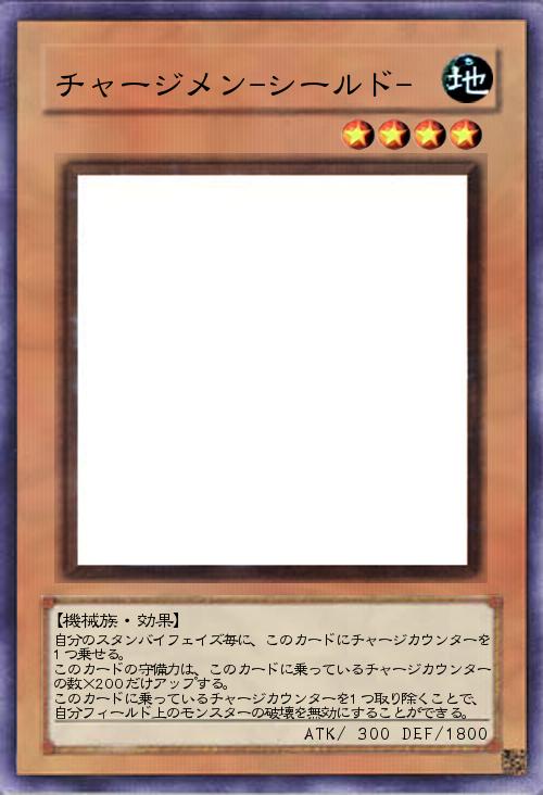 自分のスタンバイフェイズ毎に、このカードにチャージカウンターを1つ乗せる。 このカードの守備力は、このカードに乗っているチャージカウンターの数×200だけアップする。 このカードに乗っているチャージカウンターを1つ取り除くことで、自分フィールド上のモンスターの破壊を無効にすることができる。 |