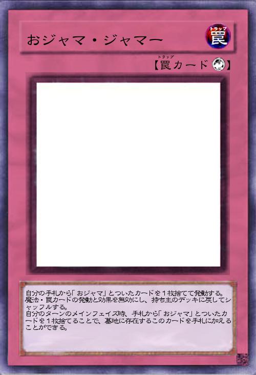 自分の手札から「おジャマ」とついたカードを1枚捨てて発動する。魔法・罠カードの発動と効果を無効にし、持ち主のデッキに戻してシャッフルする。 自分のターンのメインフェイズ時、手札から「おジャマ」とついたカードを1枚捨てることで、墓地に存在するこのカードを手札に加えることができる。 |