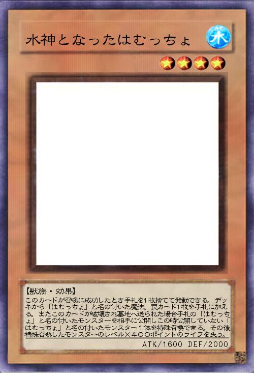 | このカードが召喚に成功したとき手札を1枚捨てて発動できる。デッキから「はむっちょ」と名の付いた魔法、罠カード1枚を手札に加える。またこのカードが破壊され墓地へ送られた場合手札の「はむっちょ」と名の付いたモンスターを相手に公開しこの時公開していない「はむっちょ」と名の付いたモンスター1体を特殊召喚できる。その後特殊召喚したモンスターのレベル×400ポイントのライフを失う。 | |||