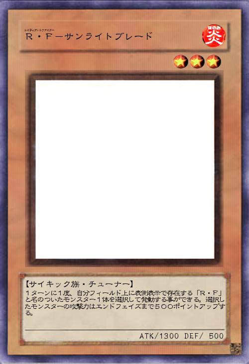 | 1ターンに1度、自分フィールド上に表側表示で存在する「R・F」と名のついたモンスター1体を選択して発動する事ができる。選択したモンスターの攻撃力はエンドフェイズまで500ポイントアップする。 | |||