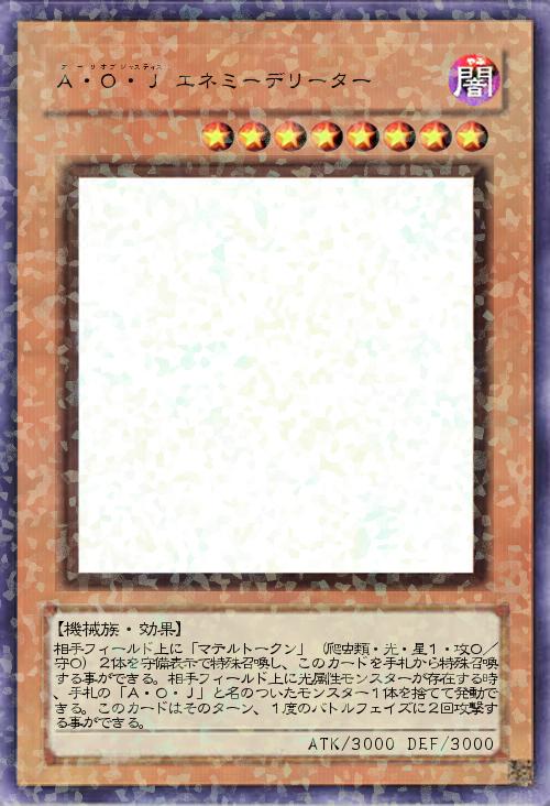 | 相手フィールド上に「マテルトークン」(爬虫類・光・星1・攻0/守0)2体を守備表示で特殊召喚し、このカードを手札から特殊召喚する事ができる。相手フィールド上に光属性モンスターが存在する時、手札の「A・O・J」と名のついたモンスター1体を捨てて発動できる。このカードはそのターン、1度のバトルフェイズに2回攻撃する事ができる。 | |||