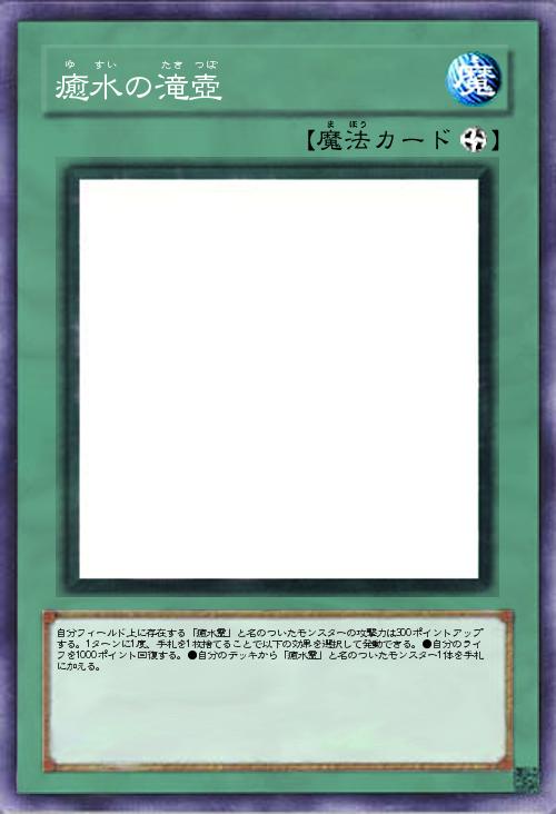 | 自分フィールド上に存在する「癒水霊」と名のついたモンスターの攻撃力は300ポイントアップする。1ターンに1度、手札を1枚捨てることで以下の効果を選択して発動できる。●自分のライフを1000ポイント回復する。●自分のデッキから「癒水霊」と名のついたモンスター1体を手札に加える。 | |||