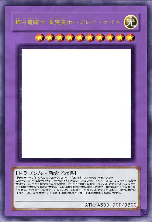「希望皇ホープ」と名のついたモンスター+「銀河眼」と名のついたモンスター このモンスターは融合召喚でしか特殊召喚できない。お互いのフィールド上に、このカードの融合素材モンスターが1体づつ存在する場合、手札を1枚捨てる事で、エクストラデッキからこのカードを融合召喚扱いで特殊召喚する。この効果で特殊召喚に成功した場合、相手はカードを2枚ドローできる。相手ターンのエンドフェイズ時、このカードをエクストラデッキに戻し、自分の墓地の「No.39 希望皇ホープ」または「銀河眼の光子竜」1体を選択して特殊召喚する。 |