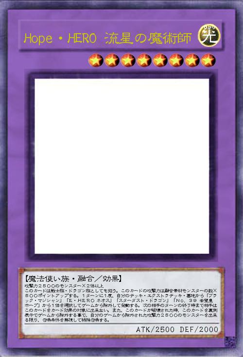 攻撃力2500のモンスター×2体以上 このカードは戦士族・ドラゴン族としても扱う。このカードの攻撃力は融合素材モンスターの数×500ポイントアップする。1ターンに1度、自分のデッキ・エクストラデッキ・墓地から「ブラック・マジシャン」「E・HERO ネオス」「スターダスト・ドラゴン」「No.39 希望皇ホープ」から1体を選択してゲームから除外して発動する。次の相手のターンの終了時まで相手はこのカードをカード効果の対象に出来ない。また、このカードが破壊された時、このカードを裏側表示でゲームから除外する事で、自分のゲームから除外された攻撃力2500のモンスターを出来る限り、召喚条件を無視して特殊召喚する。 |