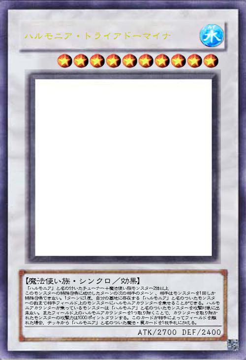 「ハルモニア」と名の付いたチューナー+魔法使い族モンスター2体以上 このモンスターの特殊召喚に成功したターンの次の相手のターン 、相手はモンスターを1回しか特殊召喚できない。1ターンに1度、自分の墓地に存在する「ハルモニア」と名のついたモンスターの数まで相手フィールド上のモンスターにハルモニアカウンターを乗せることができる。ハルモニアカウンターが乗っているモンスターは「ハルモニア」と名のついたモンスターを攻撃対象に出来ない。またフィールド上のハルモニアカウンターを1つ取り除くことで、カウンターを取り除かれたモンスターの攻撃力は1000ポイントダウンする。このカードが相手によってフィールドを離れた場合、デッキから「ハルモニア」と名のついた魔法・罠カードを1枚手札に加える。 |