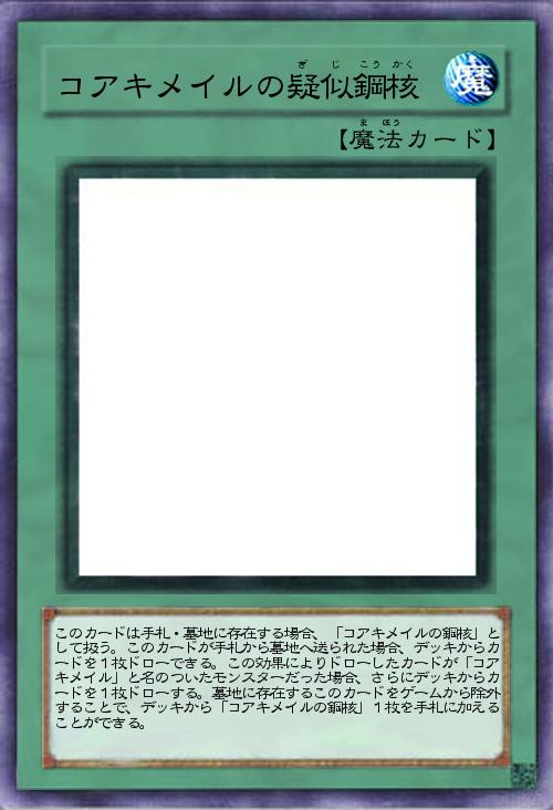 「不遇カテゴリ救済編2弾、コアキメイルです。鋼核が無いとろくに戦えないカテゴリとして、今までそれぞれが種族にあったデッキに出張するだけでしたが、このカードを使えば多少なりとも真面に戦えるのではないでしょうか。」(2013-09-08 10:26)