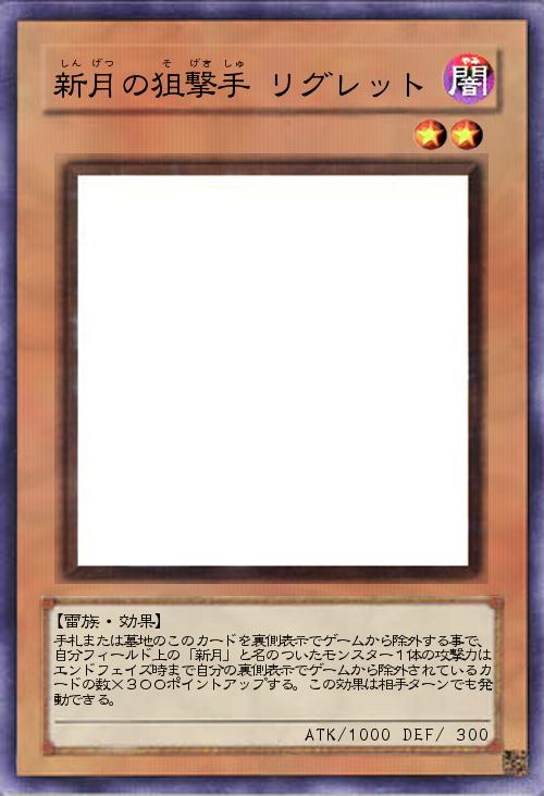| 手札または墓地のこのカードを裏側表示でゲームから除外する事で、自分フィールド上の「新月」と名のついたモンスター1体の攻撃力はエンドフェイズ時まで自分の裏側表示でゲームから除外されているカードの数×300ポイントアップする。この効果は相手ターンでも発動できる。 | |||
