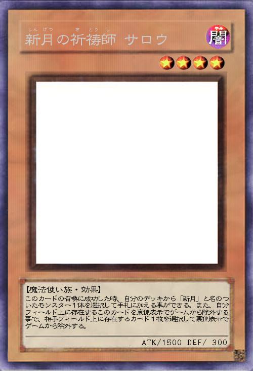 | このカードの召喚に成功した時、自分のデッキから「新月」と名のついたモンスター1体を選択して手札に加える事ができる。また、自分フィールド上に存在するこのカードを裏側表示でゲームから除外する事で、相手フィールド上に存在するカード1枚を選択して裏側表示でゲームから除外する。 | |||