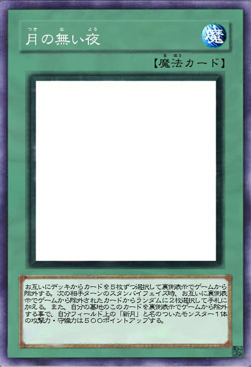 | お互いにデッキからカードを5枚ずつ選択して裏側表示でゲームから除外する。次の相手ターンのスタンバイフェイズ時、お互いに裏側表示でゲームから除外されたカードからランダムに2枚選択して手札に加える。また、自分の墓地のこのカードを裏側表示でゲームから除外する事で、自分フィールド上の「新月」と名のついたモンスター1体の攻撃力・守備力は500ポイントアップする。 | |||