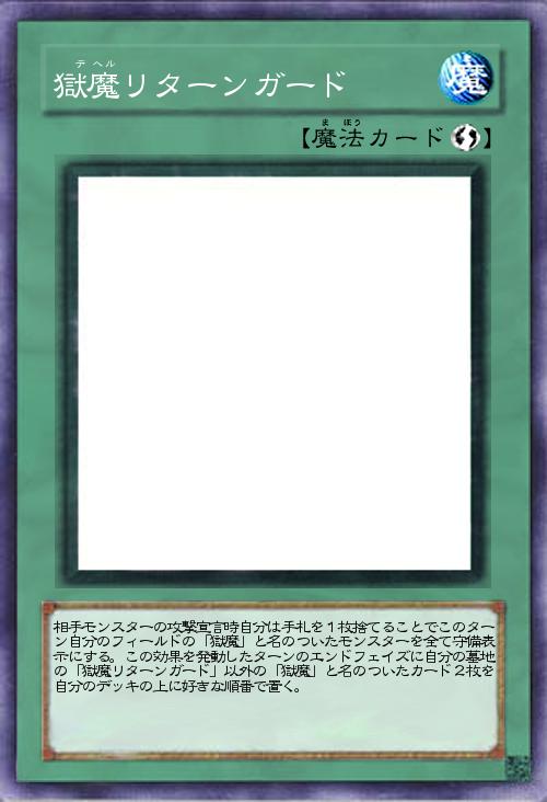 | 相手モンスターの攻撃宣言時自分は手札を1枚捨てることでこのターン自分のフィールドの「獄魔」と名のついたモンスターを全て守備表示にする。この効果を発動したターンのエンドフェイズに自分の墓地の「獄魔リターンガード」以外の「獄魔」と名のついたカード2枚を自分のデッキの上に好きな順番で置く。 | |||