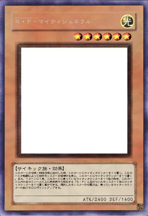 | このカードが召喚・特殊召喚に成功した時、このカードにマイティカウンターを1つ置く。このカードが戦闘によって相手モンスターを破壊する度に、このカードにマイティカウンターを1つ置く。また、1ターンに1度、このカードに乗っているマイティカウンターを1つ取り除き、このカード以外の自分フィールド上に表側表示で存在する「R・F」と名のついたモンスター1体にマイティカウンターを1つ置く事ができる。選択したモンスターの攻撃力は、乗っているマイティカウンターの数×500ポイントアップする。 | |||