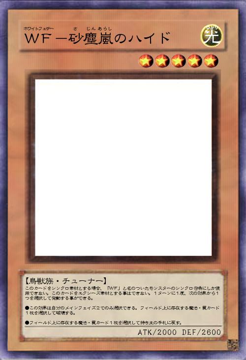 このカードをシンクロ素材とする場合、「WF」と名のついたモンスターのシンクロ召喚にしか使用できない。このカードをエクシーズ素材とする事はできない。1ターンに1度、次の効果から1つを選択して発動する事ができる。 ●この効果は自分のメインフェイズ2でのみ選択できる。フィールド上に存在する魔法・罠カード1枚を選択して破壊する。 ●フィールド上に存在する魔法・罠カード1枚を選択して持ち主の手札に戻す。 |