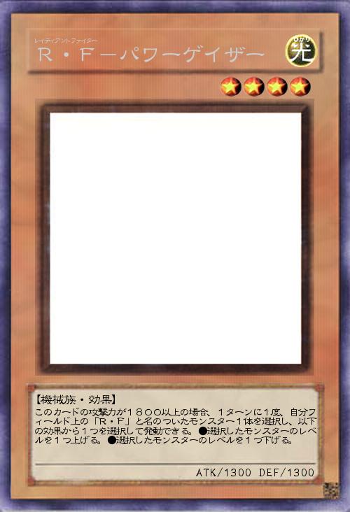 | このカードの攻撃力が1800以上の場合、1ターンに1度、自分フィールド上の「R・F」と名のついたモンスター1体を選択し、以下の効果から1つを選択して発動できる。●選択したモンスターのレベルを1つ上げる。●選択したモンスターのレベルを1つ下げる。 | |||