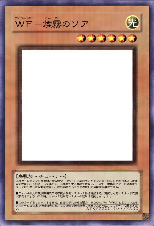 このカードをシンクロ素材とする場合、「WF」と名のついたモンスターのシンクロ召喚にしか使用できない。このカードをエクシーズ素材とする事はできない。「WF-煙霧のソア」の効果は1ターンに1度しか発動できない。次の効果から1つを選択して発動する事ができる。 ●フィールド上に裏側守備表示で存在するモンスター1体を選択する。選択したモンスターを表側攻撃表示にする(この時、リバース効果モンスターの効果は発動しない。)。 ●このカードをリリースする事で、自分の手札から攻撃力1500以下の「WF」と名のついたモンスターを2体まで特殊召喚する。この方法で特殊召喚したモンスターは、このターン攻撃できない。 |