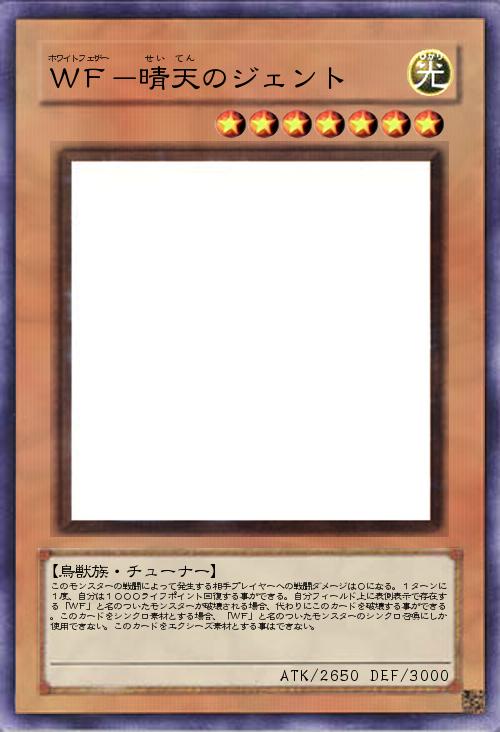 | このモンスターの戦闘によって発生する相手プレイヤーへの戦闘ダメージは0になる。1ターンに1度、自分は1000ライフポイント回復する事ができる。自分フィールド上に表側表示で存在する「WF」と名のついたモンスターが破壊される場合、代わりにこのカードを破壊する事ができる。このカードをシンクロ素材とする場合、「WF」と名のついたモンスターのシンクロ召喚にしか使用できない。このカードをエクシーズ素材とする事はできない。 | |||