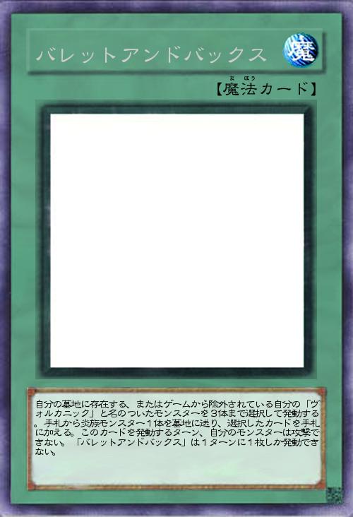 | 自分の墓地に存在する、またはゲームから除外されている自分の「ヴォルカニック」と名のついたモンスターを3体まで選択して発動する。手札から炎族モンスター1体を墓地に送り、選択したカードを手札に加える。このカードを発動するターン、自分のモンスターは攻撃できない。「バレットアンドバックス」は1ターンに1枚しか発動できない。 | |||