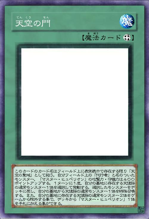 | このカードのカード名はフィールド上に表側表示で存在する限り「天空の聖域」として扱う。自分フィールド上の「代行者」と名のついたモンスター、「マスター・ヒュペリオン」の攻撃力・守備力は400ポイントアップする。1ターンに1度、自分の墓地に存在する天使族の通常モンスター1体を選択して発動する。選択したモンスターをデッキに戻し、自分の墓地から天使族の通常モンスター1体を特殊召喚する。また、自分の墓地に存在する天使族の通常モンスター2体をゲームから除外する事で、デッキから「マスター・ヒュペリオン」1体を手札に加える事ができる。 | |||