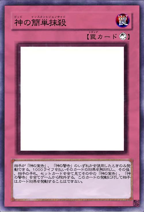 | 相手が「神の宣告」、「神の警告」のいずれかを使用したときのみ発動できる。1000ライフを払いそのカードの効果を無効化し、その後、相手の手札、セットカードを全て見てその中の「神の宣告」、「神の警告」を全てゲームから除外する。このカードの発動に対して相手はカード効果を発動することはできない。 | |||