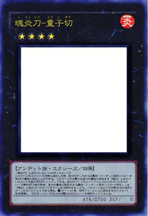 「魂炎刀」と名のついたレベル4モンスター×3 このカードのエクシーズ召喚に成功した時、自分のデッキから炎属性・アンデット族モンスターを3体まで墓地に送ることができる。このカードの攻撃力は自分の墓地に存在する「魂炎」と名のついたカードの数×300ポイントアップする。自分のターンのメインフェイズにこのカードのエクシーズ素材を1つ取り除き、自分の墓地に存在する炎属性・アンデット族モンスター1体もしくは「魂炎」と名のついたカードをゲームから除外することで、このカードは以下の効果を次の相手のターンのエンドフェイズまで得る。●1ターンに1度、相手フィールド上に存在するモンスター1体を破壊し、そのモンスターの元々の攻撃力分のダメージを相手ライフに与える。 |
