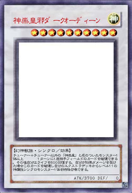 | チューナー+チューナー以外の「神崇皇」と名のついたモンスター1体以上 1ターンに1度相手フィールドのカードを破壊できる。その後自分はライフを800回復する。自分が効果ダメージを受けた場合このカードを破壊し自分のエクストラデッキからレベル11の神属性シンクロモンスター1体を特殊召喚できる。 | |||