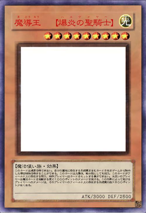 | このカードは通常召喚できない。自分の墓地に存在する永続罠を含むカード5枚をゲームから除外した場合特殊召喚することができる。このカードは炎属性、戦士族としても扱う。このカードがフィールド上に存在する限り、相手プレイヤーはカードをセットする事ができない。お互いのプレイヤーは魔法カードを発動する度に1000ポイントのダメージを受ける。この効果によって受けるプレイヤーへのダメージは、そのプレイヤーのフィールド上に存在する永続罠の数×500ポイント少なくなる。 | |||