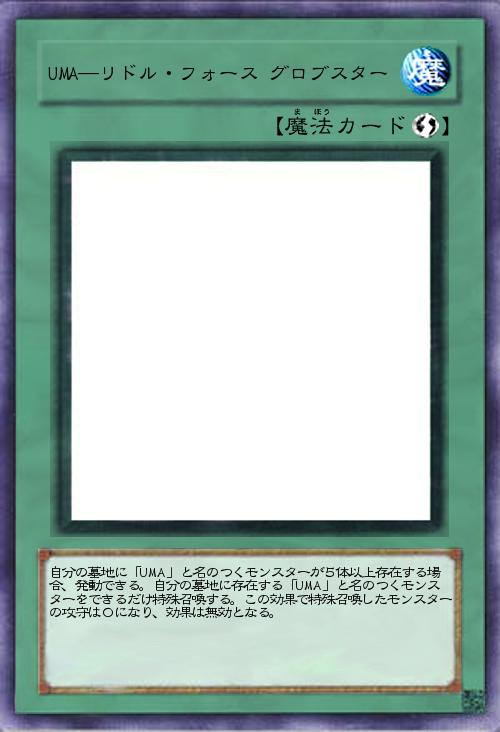 | 自分の墓地に「UMA」と名のつくモンスターが5体以上存在する場合、発動できる。自分の墓地に存在する「UMA」と名のつくモンスターをできるだけ特殊召喚する。この効果で特殊召喚したモンスターの攻守は0になり、効果は無効となる。 | |||