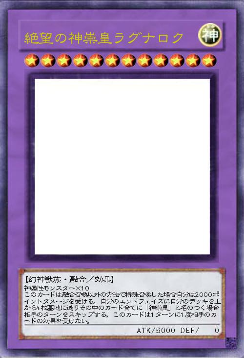 神属性モンスター×10 このカードは融合召喚以外の方法で特殊召喚した場合自分は2000ポイントダメージを受ける。自分のエンドフェイズに自分のデッキを上から4枚墓地に送りその中のカード全てに「神崇皇」と名のつく場合相手のターンをスキップする。このカードは1ターンに1度相手のカードの効果を受けない。 |
